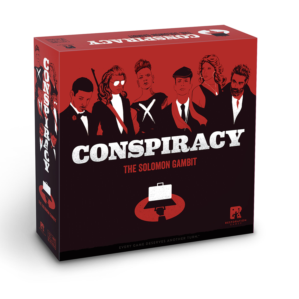 The briefcase is out in the open, and six freelance agents are in the field. In Conspiracy: The Solomon Gambit, a restoration of the 1973 classic game conspiracy, players vie for control of the agents by secretly paying them off and using them to move the briefcase across Europe, trying to get it to their HQ. But other players can challenge and stop an agent from moving if they have paid more than you — and for the right price they can even assassinate another agent. In addition to a slick new look, this restored edition offers two new twists on the original gameplay. First, each agent has a unique ability that lets them move an agent or the briefcase for free. Second, an alternate win condition eliminates stalling and potential stalemates. If no one wins within a certain number of turns, Dr. Solomon can end the game immediately, and whoever has paid off the most to him wins the game. However, if you pay off too much to Dr. Solomon early in the game, that can leave you with little control over the other agents, forcing you to strike a tricky balance between immediate and long-term goals.
