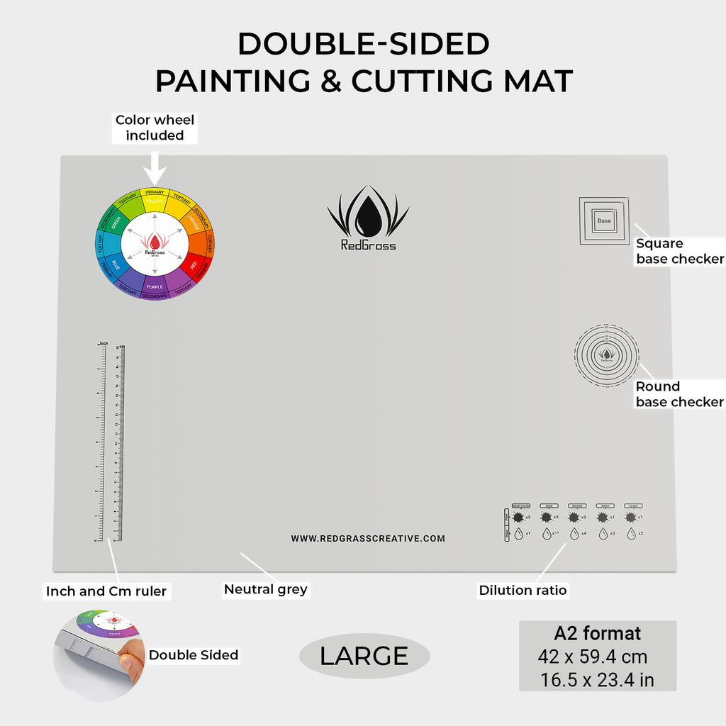 Protect your desk with the Redgrassgames cutting and painting mat for miniature painting. This custom-made painting mat comes in a neutral gray to help you focus on your painting session. Available in A2 format, it includes just the right amount of useful guides. Round and square checkers, dilution ratios for beginners, an inch/cm ruler, and the Redgrass color wheel! It is also your ideal cutting mat for all your hobbies. Self-healing but also double-sided, it will serve you a long time.